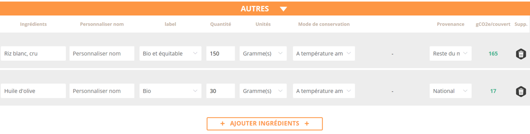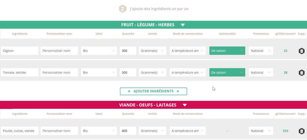 2. Je découvre le poids carbone de ma recette et je réajuste si je souhaite la baisser.